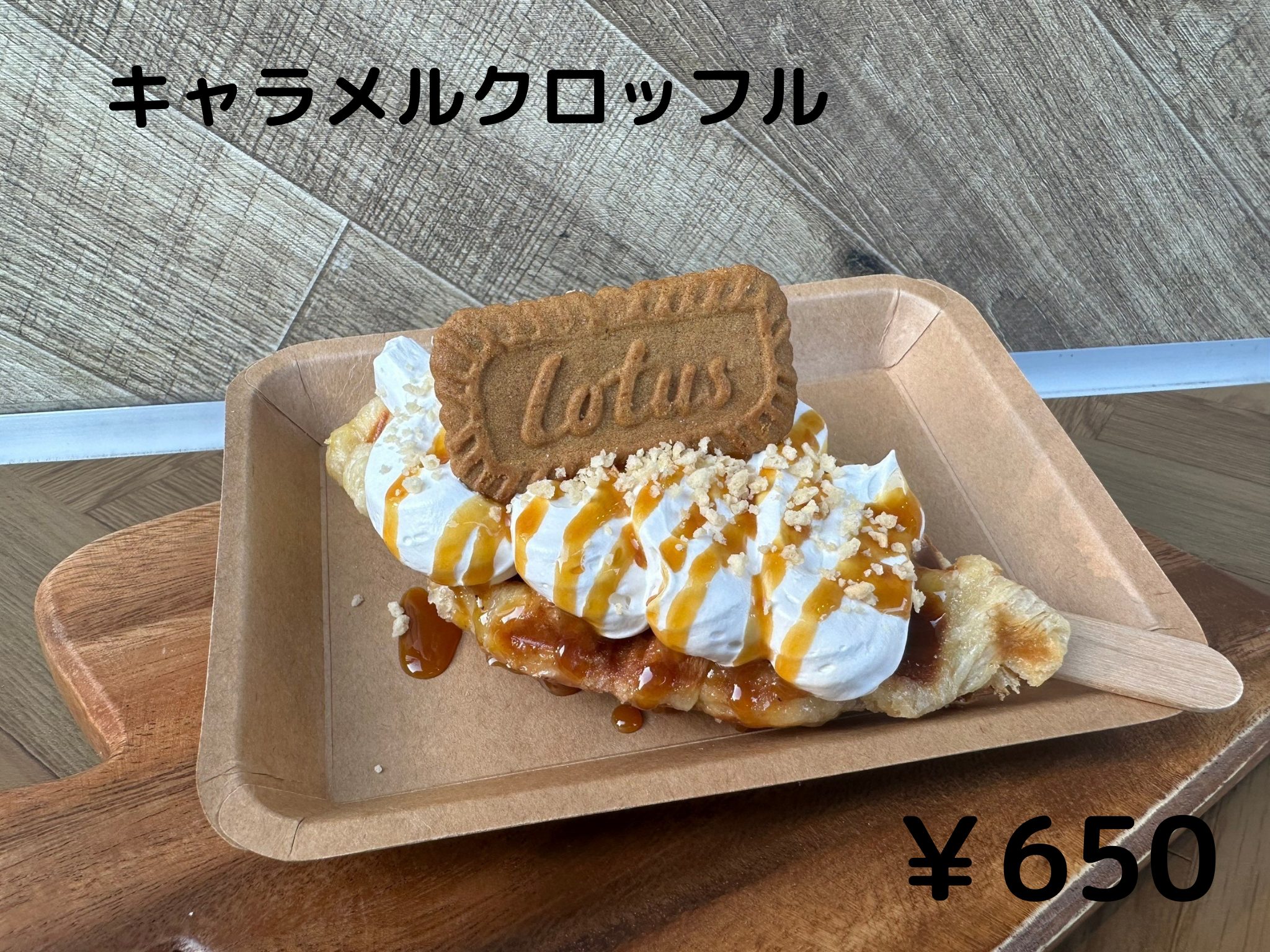 クロワッサンとワッフルを組み合わせた韓国発祥のスイーツ「クロッフル」は、イチゴやキャラメル、クッキーにチョコレートをトッピングしたものなど数種類が登場。大きなソーセージをサンドしたホットドッグや、生フランク、ソフトクリーム、ドリンク各種なども販売予定。