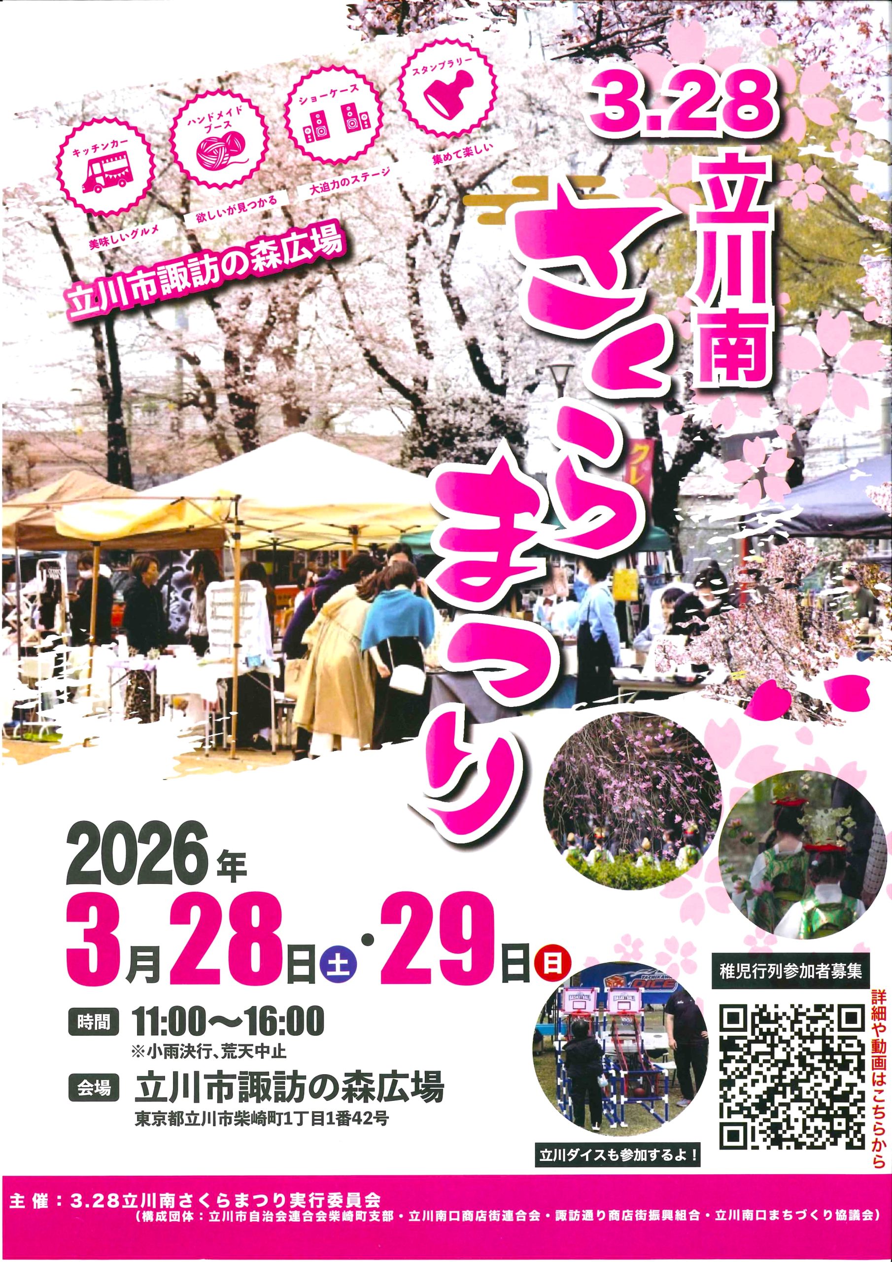 2026年3月28日(土)・29日(日)の2日間、立川市・諏訪の森広場で開催される「さくらまつり」。時間は両日とも11:00〜16:00です。