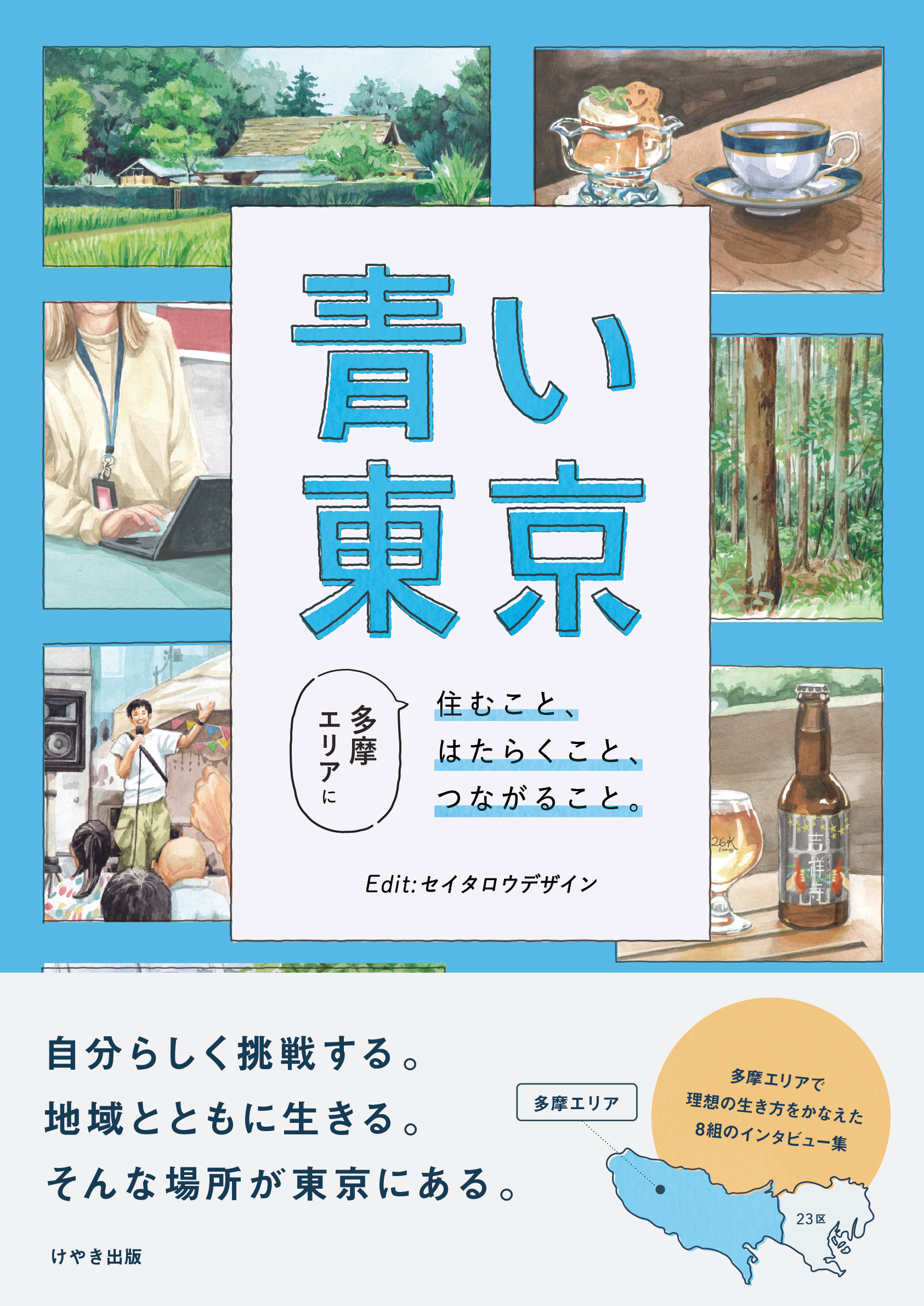 本書『青い東京』は、デザイン会社・セイタロウデザインが企画・編集・デザインを手がけた一冊。23区で働くという選択ではなく、多摩で働くことを選んだ8組にそれぞれの生き方・働き方、そして地域との関わり方についてインタビューを行っています。